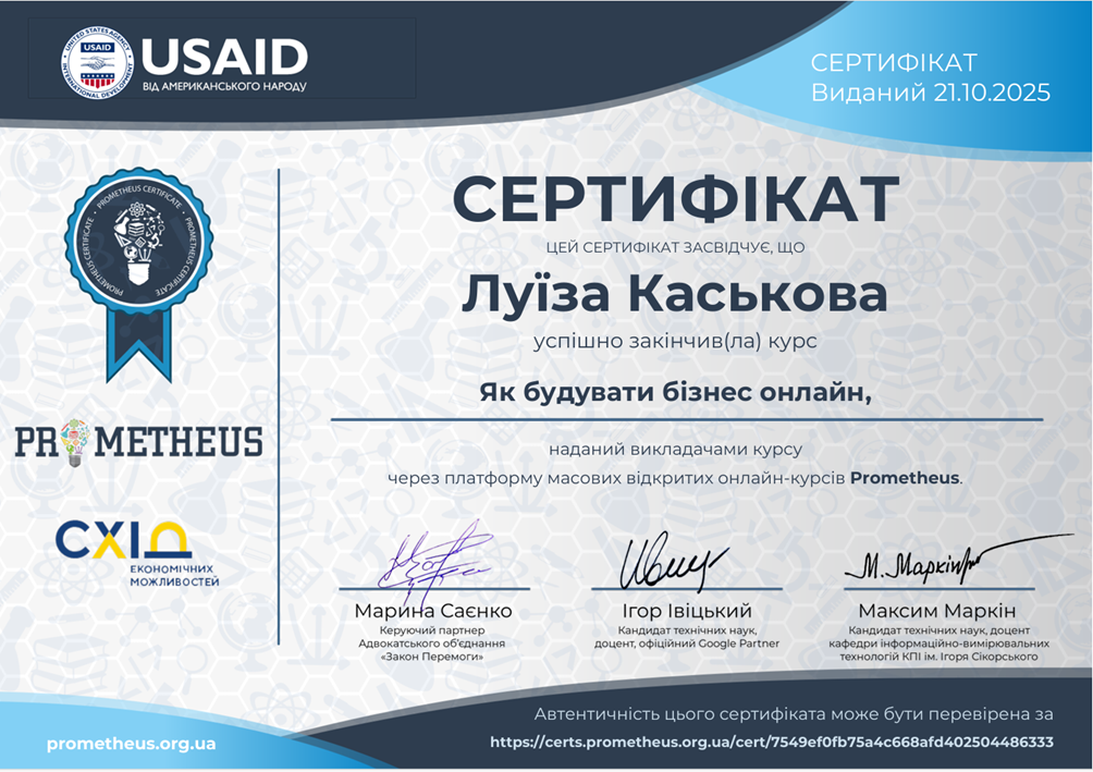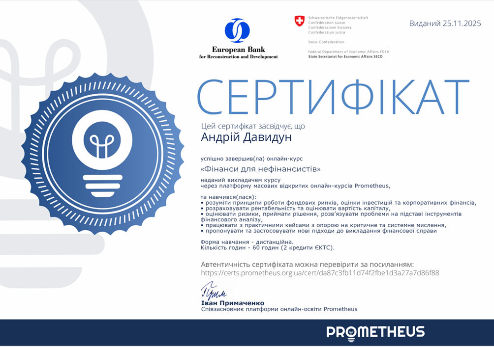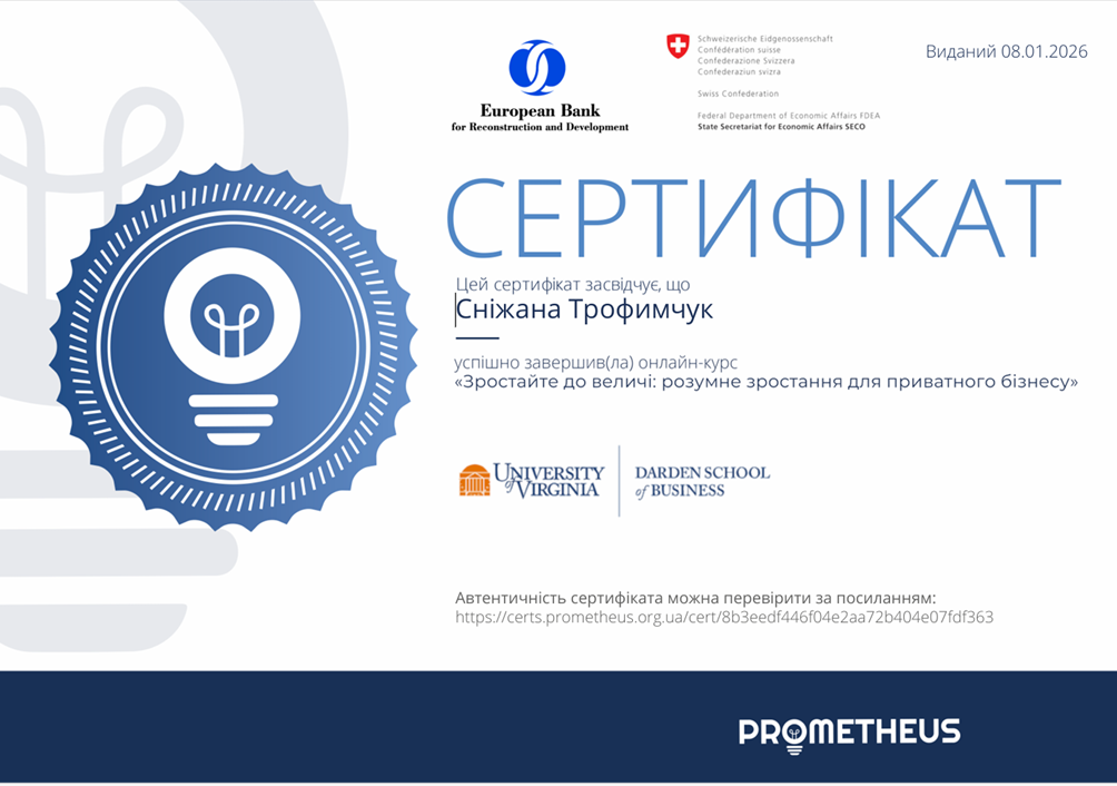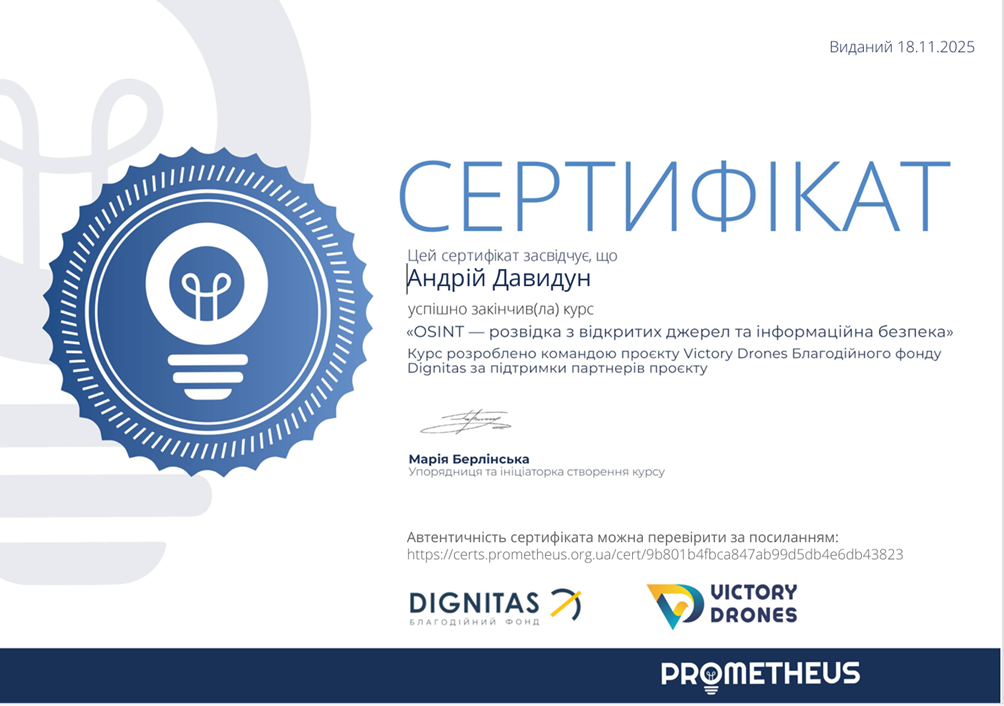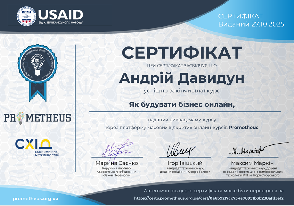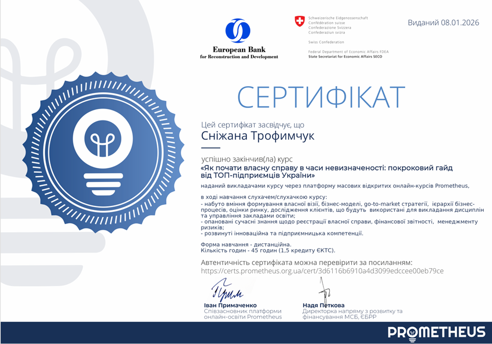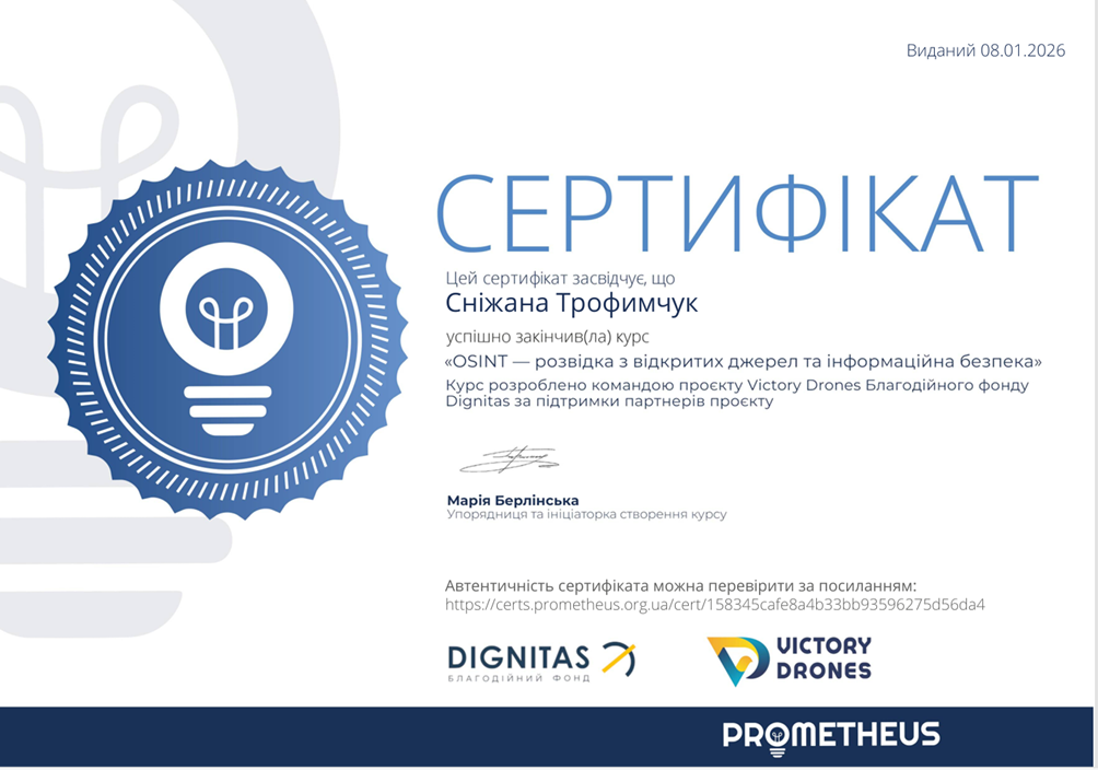 З метою вдосконалення практичних навичок з питань фінансового управління, підприємницької діяльності та інформаційної безпеки бізнесу з дисципліни «Економічна безпека бізнесу» у межах вивчення тем «Фінансова складова економічної безпеки бізнесу», «Інформаційна безпека як вагома складова економічної безпеки бізнесу» студенти гр. УПД-23-1, УПДз-23-1 Андрій Давидун, Сніжана Трофимчук, Луїза Каськова пройшли курси «Як почати власну справу в часи невизначеності: покроковий гайд від ТОП-підприємців України», «Як будувати бізнес онлайн», «Фінанси для нефінансистів», «OSINT – розвідка з відкритих джерел та інформаційна безпека», «Зростайте до величі: розумне зростання для приватного бізнесу» на платформі Прометеус та отримали сертифікати.