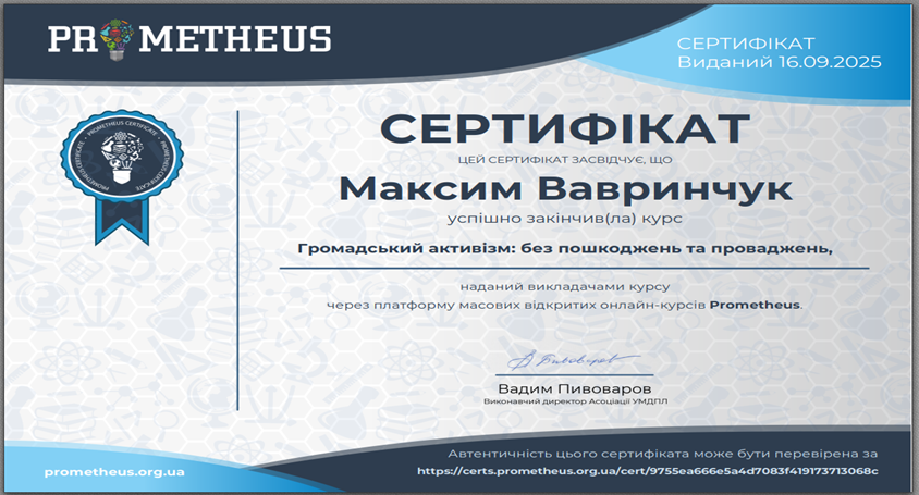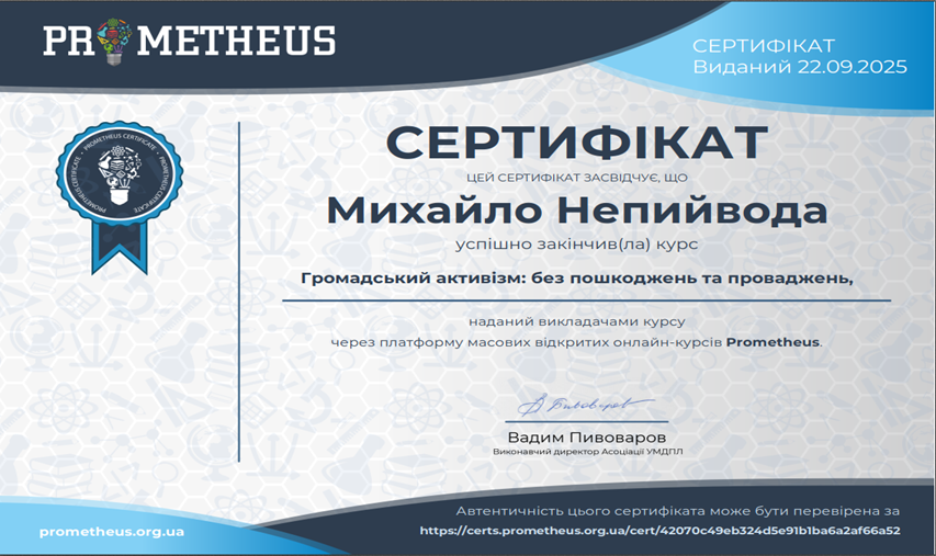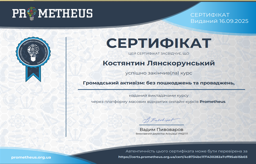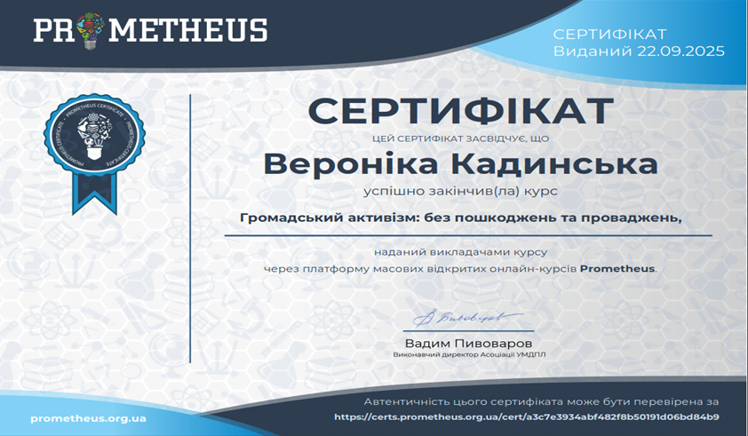 З метою вдосконалення навичок генерації бізнес-ідей, розробки стартап-проєктів, аналізу ринку, бізнес-моделювання, фінансового планування, оцінювання ризиків, цифрового підприємництва, командної роботи, презентації стартап-ідей та масштабування бізнесу у межах вивчення тем «Підприємництво та інновації в креативній економіці», «Основи ефективного планування процесів в креативних індустріях», «Цифрова економіка як складова креативної економіки» з дисципліни «Громадянське суспільство, економіка та управління» студенти гр. КН-23-1 пройшли курси «Громадський активізм: без пошкоджень та проваджень» на платформі Прометеус та отримали сертифікати.