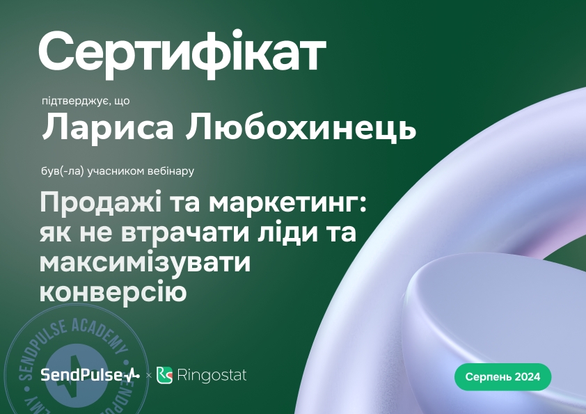 2024р. – Вебінар від Академії SendPulse «Продажі та маркетинг: як не втрачати ліди та максимізувати конверсію», 15.08.2024. Сертифікат (№1-2024)