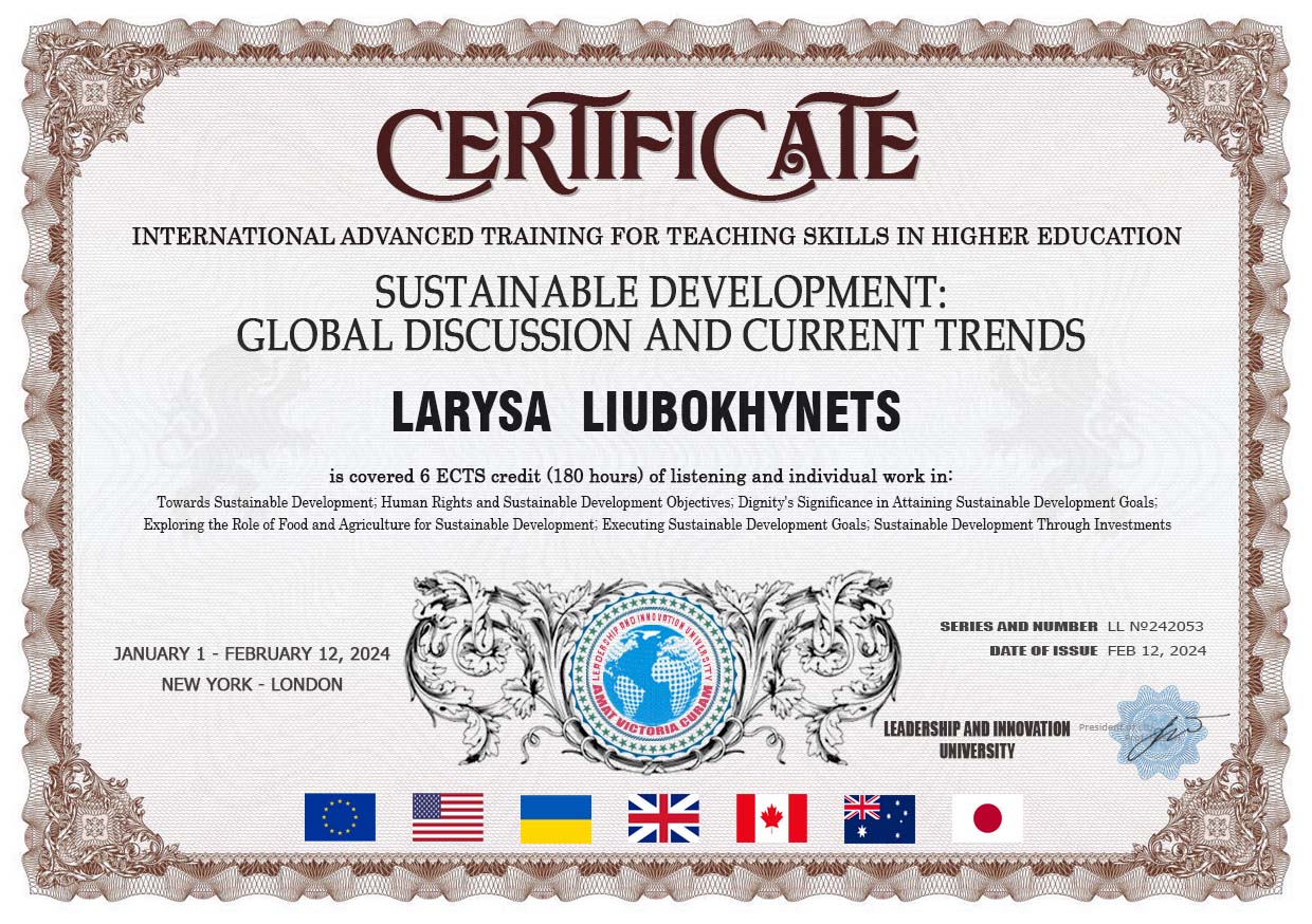 2024р. – Міжнародне підвищення кваліфікації «Sustainable Development: Global Discussion and Current Trends» на базі ГО «Університет лідерства та інновацій» 01.01.2024 р. до 12.02.2024 р (180 год. – 6 кредитів ECTS). Сертифікат (LL №242053 від 12.02.2024) Наказ від 29.12.2023 №196-КП