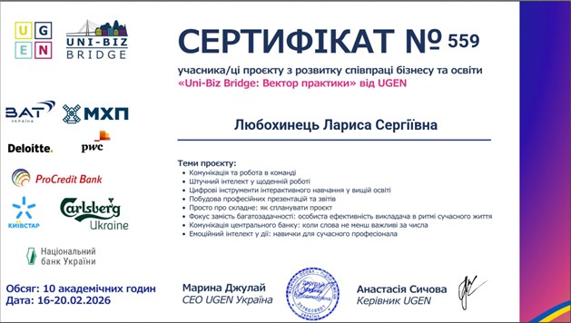 2024р. – Участь в проекті з розвитку співпраці бізнесу та освіти Uni-Biz Bridge від Ugen «Сучасний викладач» 27-29 лютого 2024 р. (12 годин). Сертифікат №131