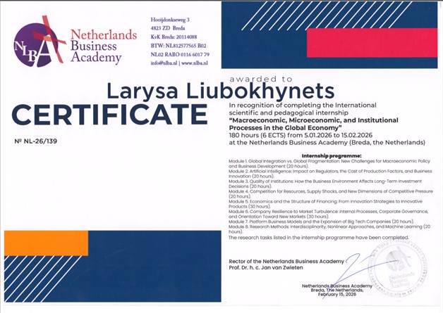 2026р. – Міжнародне науково-педагогічне стажування «Макроекономічні, мікроекономічні та інституційні процеси у світовій економіці» у Нідерландській бізнес-академії (Бреда, Нідерланди). Термін: 05.01.2026 по 15.02.2026 Наказ від 31.12.2025 № 202-КП Сертифікат № NL-26/139 від 15.02.2026р. Обсяг: 180 год. (6 кредитів ЄКТС)