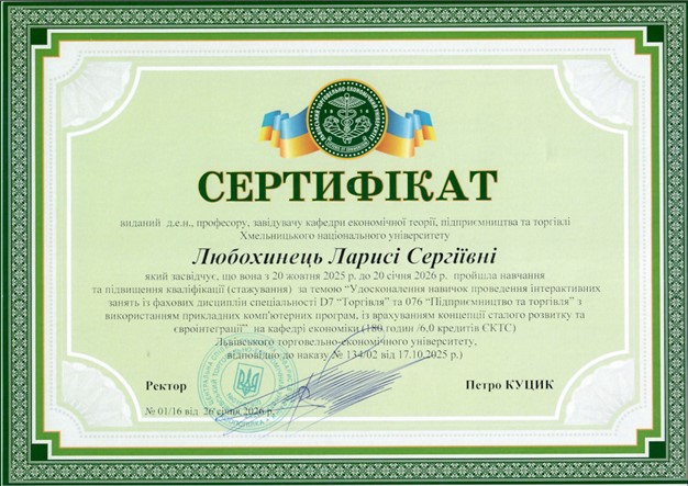 2025-2026р. – Підвищення кваліфікації у Львівському торговельно-економічному університеті (м. Львів) без відриву від виробництва за темою «Удосконалення навичок проведення інтерактивних занять із фахових дисциплін спеціальності D7 «Торгівля» з використанням прикладних комп’ютерних програм та із врахуванням концепції сталого розвитку» на кафедрі економіки. Термін: 20.10.2025р–20.01.2026р. Наказ від 17.10.2025 № 164-КП Сертифікат № 01/16 від 26.01.2026р. Обсяг: 180 год. (6 кредитів ЄКТС)