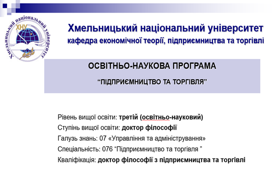 10 лютого 2023 року гарантом освітньо-наукової програми Ольгою Гончар за підтримки викладачів кафедри економічної теорії, підприємництва та торгівлі було організовано обговорення проєкта освітньо-наукової програми «Підприємництво та торгівля» за спеціальністю 076 «Підприємництво та торгівля» третього (освітньо-наукового) рівня вищої освіти.