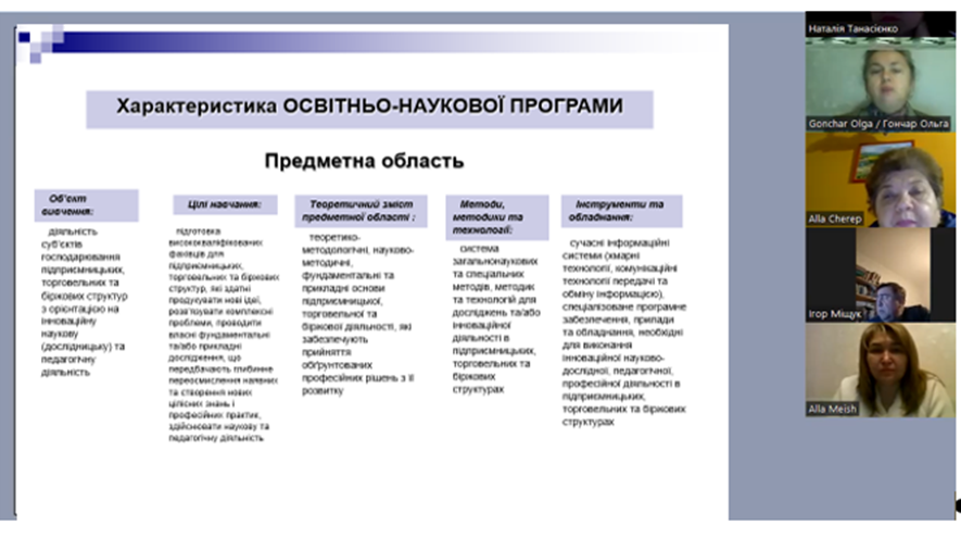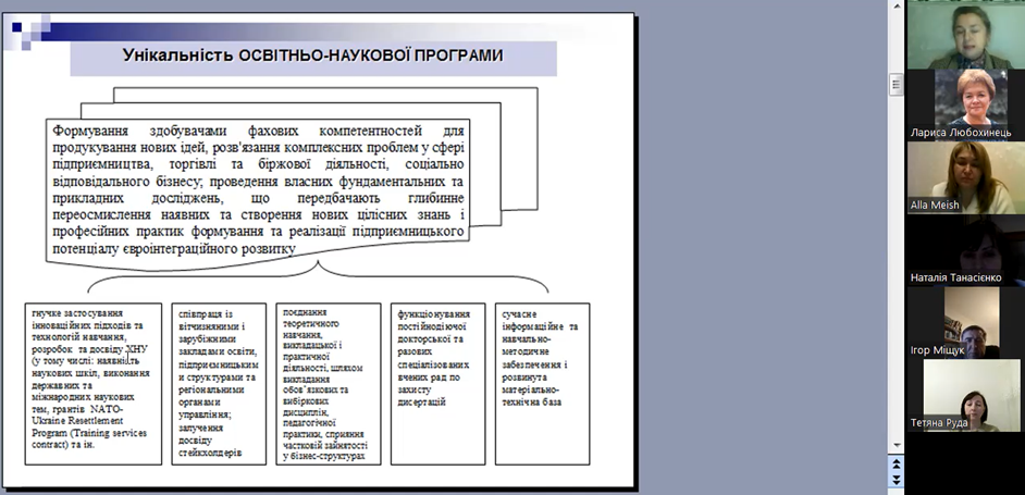 Гарант освітньої програми д.е.н., проф. Ольга Гончар охарактеризувала освітньо-наукову програму, представила її унікальність, особливості викладання та навчання, інформаційне та навчально-методичне забезпечення.
