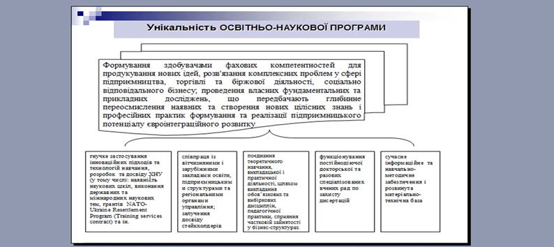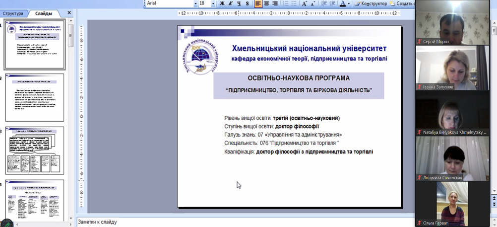 Керівник проєктної групи розробки освітньо-наукової програми д.е.н., проф. Ольга Гончар зазначила, що ОНП розроблена відповідно до Стандарту вищої освіти за спеціальністю 076 «Підприємництво, торгівля та біржова діяльність» для третього (освітньо-наукового) рівня вищої освіти, затвердженого наказом МОНУ від 10.07.2022 №645, охарактеризувала її унікальність, відповідність тенденціям розвитку ринку праці, галузевого та регіонального контексту.