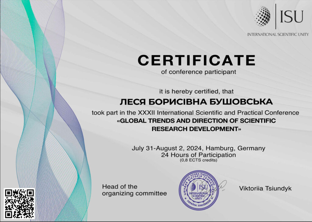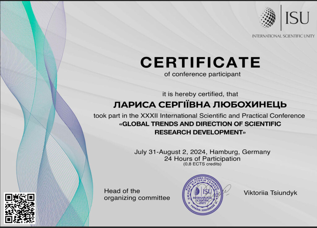 Любохинець Л.С., Бушовська Л.Б. – XXXІІ International scientific and practical conference «Global Trends and Direction of Scientific Research Development» (July 31-August 2, 2024) Hamburg, Germany. International Scientific Unity, 2024.