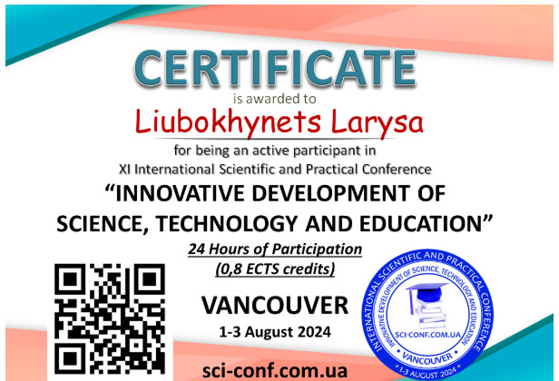Liubokhynets L., Drazhnitsya S., Lisovsky І. The 11th International scientific and practical conference “Innovative development of science, technology and education” (August 1-3, 2024) Perfect Publishing, Vancouver, Canada. 2024.