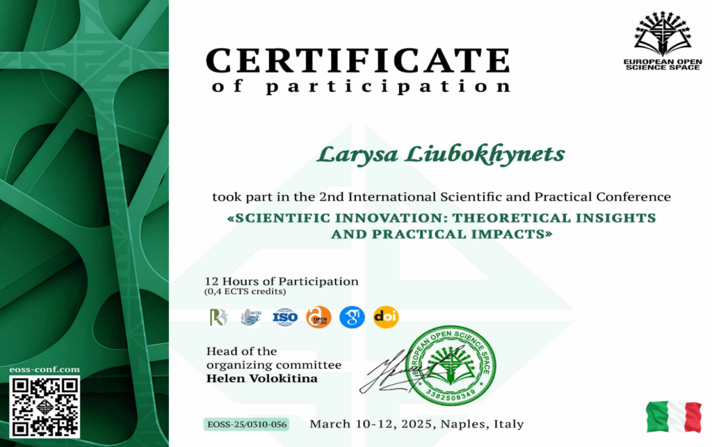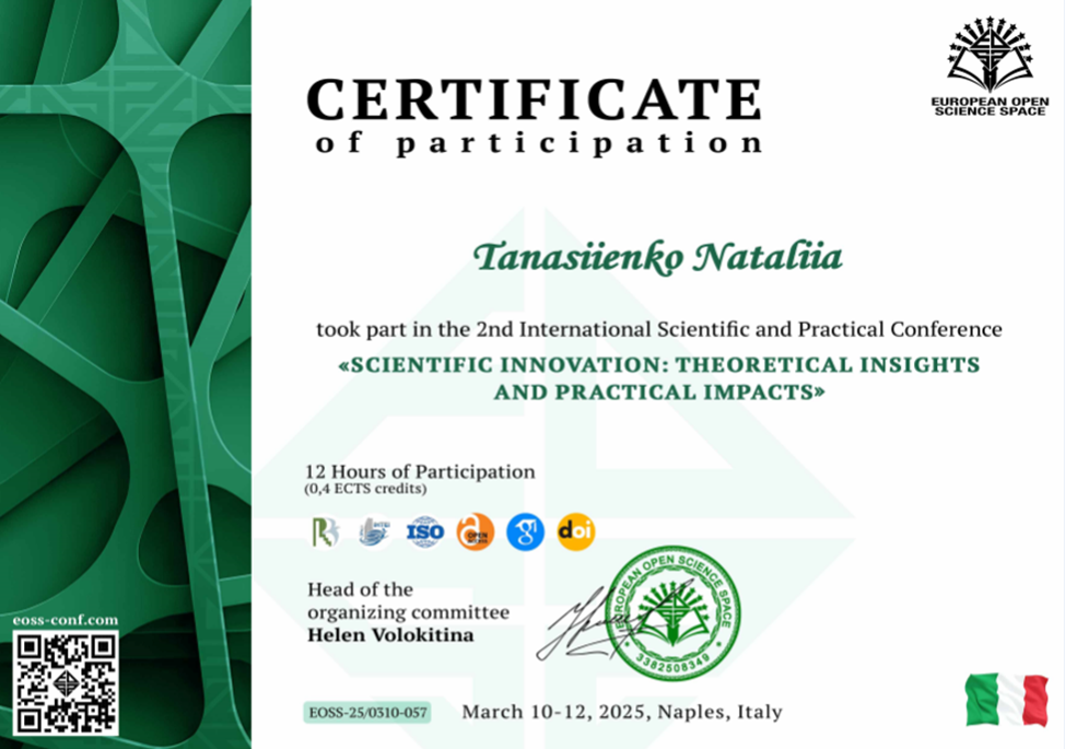 Любохинець Л.С., Танасієнко Н.П. – 2nd International Scientific and Practical Conference «Scientific Innovation: Theoretical Insights and Practical Impacts» (March 10-12, 2025. Naples, Italy).