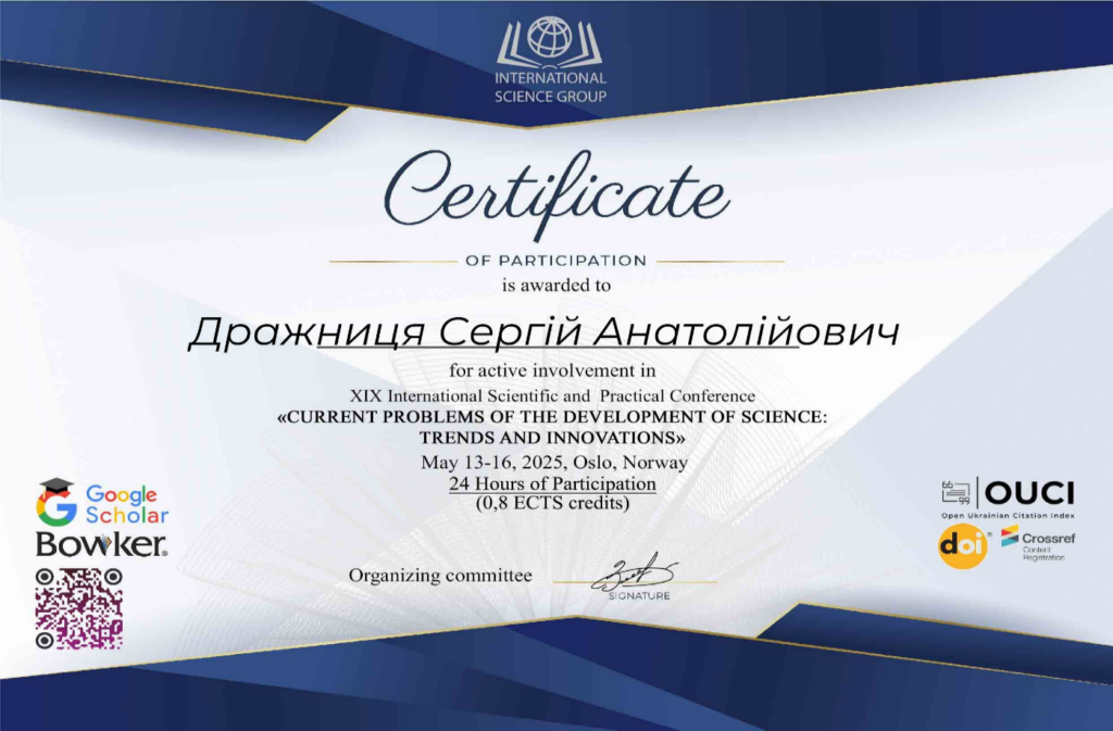 Дражниця С.А. – XIX Міжнародна науково-практична конференція «Current problems of the development of science: trends and innovations» May 13-16, 2025, Oslo, Norway.