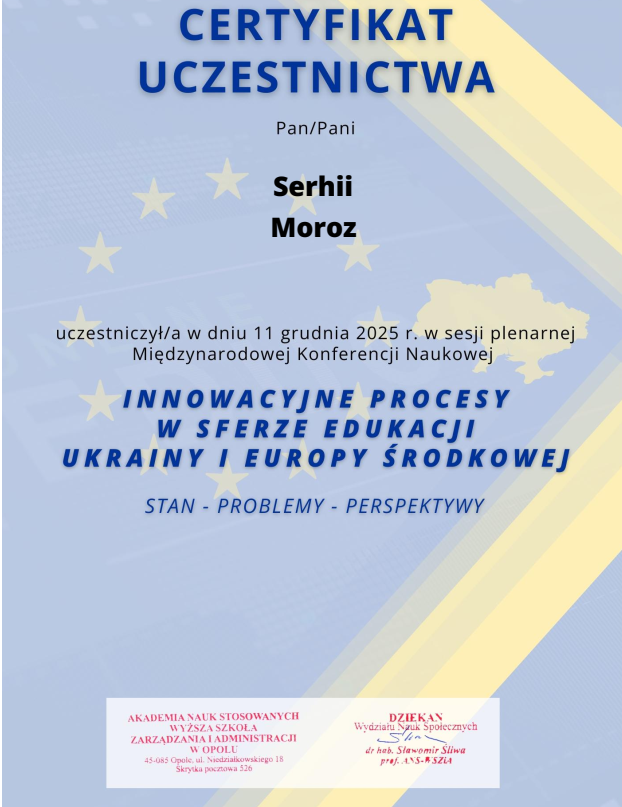 Мороз С.В. – Міжнародна наукова конференція «Інноваційні процеси в освіті в Україні та Центральній Європі. Стан, проблеми та перспективи». 11 грудня 2025