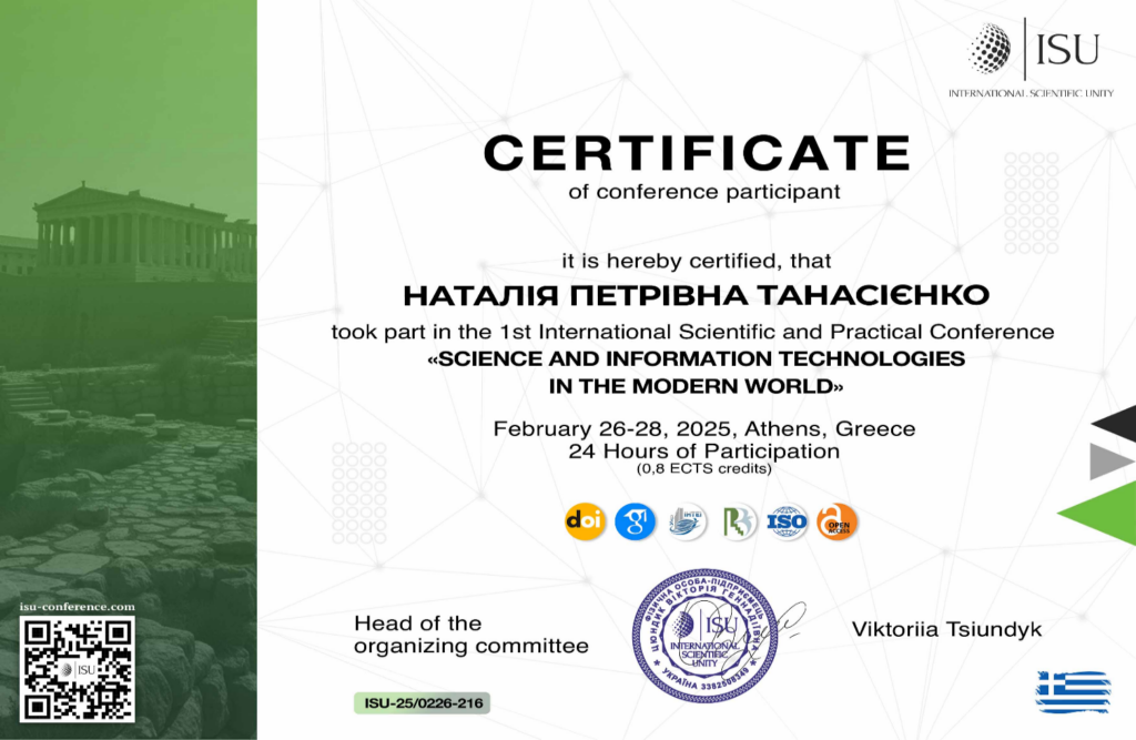 Руда Т.В. – Advanced Technologies in Scientific Research: Collection of Scientific Papers with Proceedings of the 2nd International Scientific and Practical Conference. International Scientific Unity. November 19-21, 2025. Rotterdam, Netherlands, p. 127-130. URL: https://isu-conference.com/wp-content/uploads/2025/11/Rotterdam_Netherlands_19.11.25.pdf